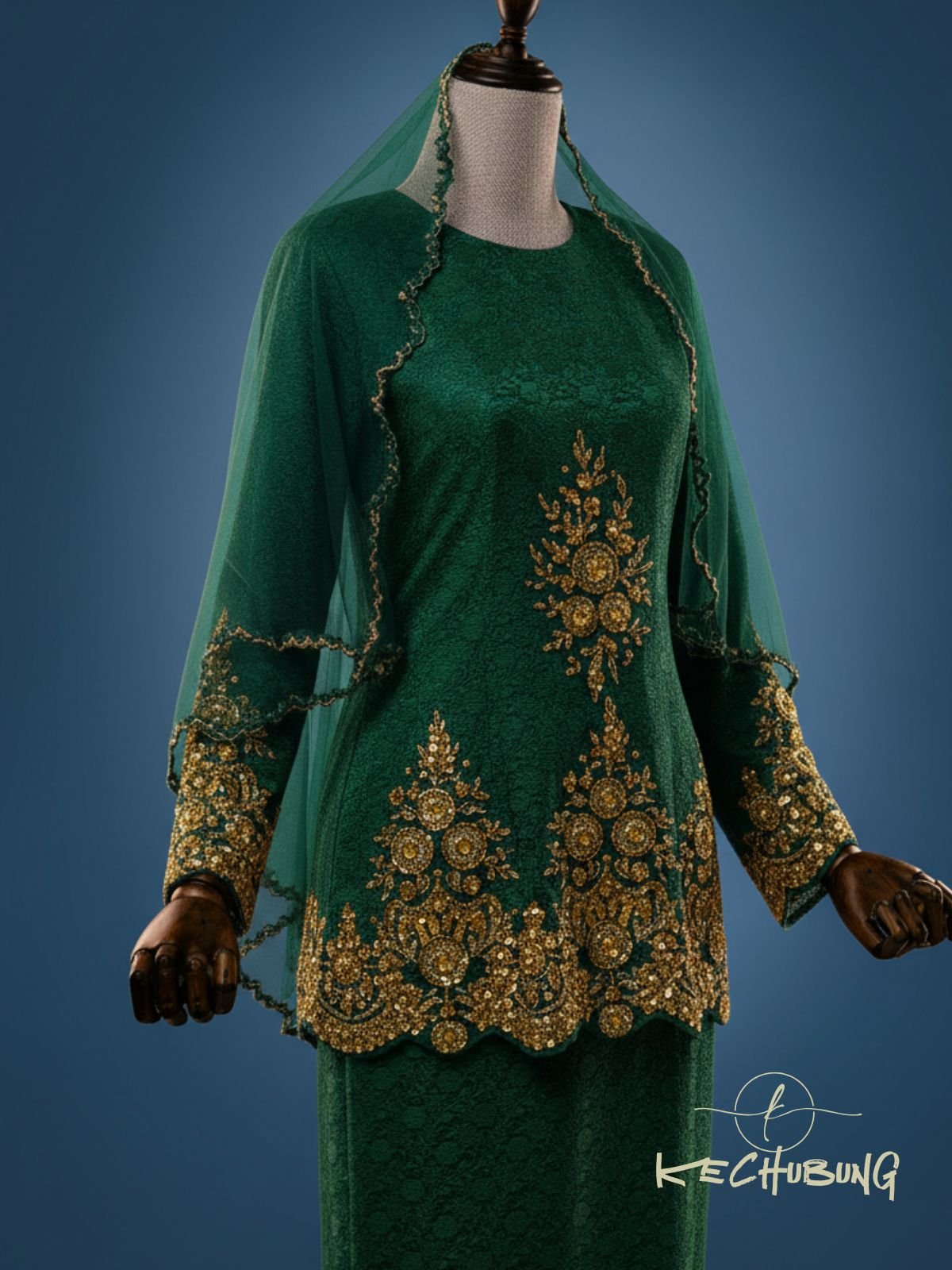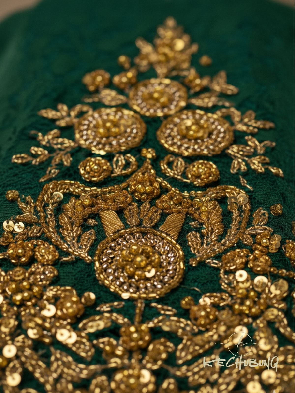 Warna emas berkilau pada sulaman lace ini mencipta kontras sempurna dengan fabrik hijau zamrud yang menjadi asas busana. Gabungan warna hijau dan emas melambangkan kemewahan, kedamaian, serta keseimbangan – seolah menggambarkan kesucian cinta dan keindahan tradisi yang dijunjung tinggi dalam adat Melayu. Emas yang berkilau di bawah cahaya lampu pelamin menghasilkan kesan mewah dan elegan, menjadikan pemakai kelihatan bersinar dan berkeyakinan di majlis resepsi.