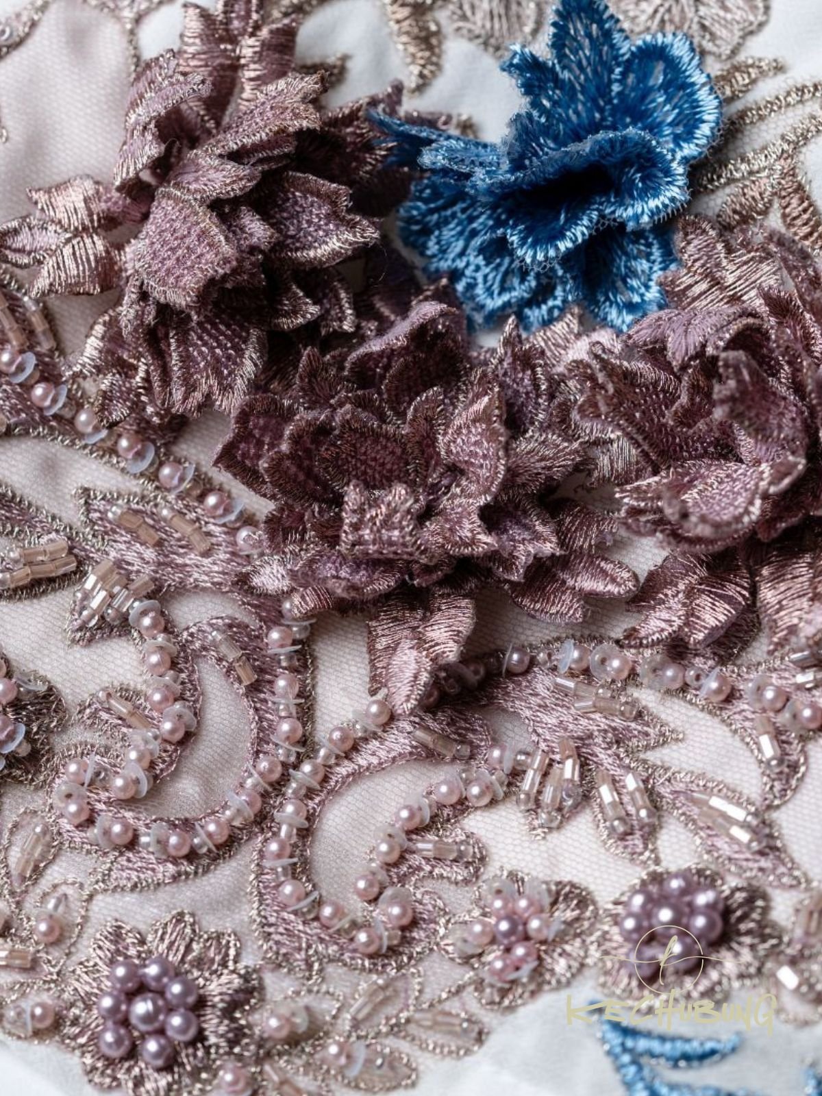 Setiap kuntum bunga disulam dengan gradasi warna halus, menonjolkan keindahan semula jadi dan kesegaran flora yang menjadi inspirasi utama rekaan. Warna coklat memberikan kehangatan, biru pastel membawa ketenangan, manakala putih melambangkan kesucian cinta dua jiwa. Keseluruhannya, kombinasi warna sulaman ini menjadikan busana tampak eksklusif, elegan dan sangat mempesona di pandangan pertama.