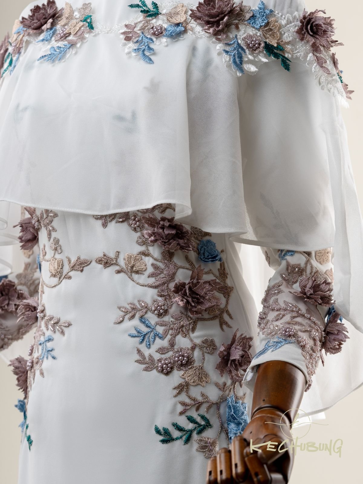 Busana indah ini merupakan tempahan khas daripada pelanggan istimewa yang menetap di Damansara untuk majlis resepsi perkahwinan beliau. Direka oleh Butik Kechubung, rekaan ini menonjolkan keanggunan moden yang berpadu dengan kelembutan tradisi. Potongan Cape Long Dress yang elegan memberikan kesan beralun dan sopan, sesuai digayakan oleh pengantin yang mementingkan gaya klasik kontemporari.